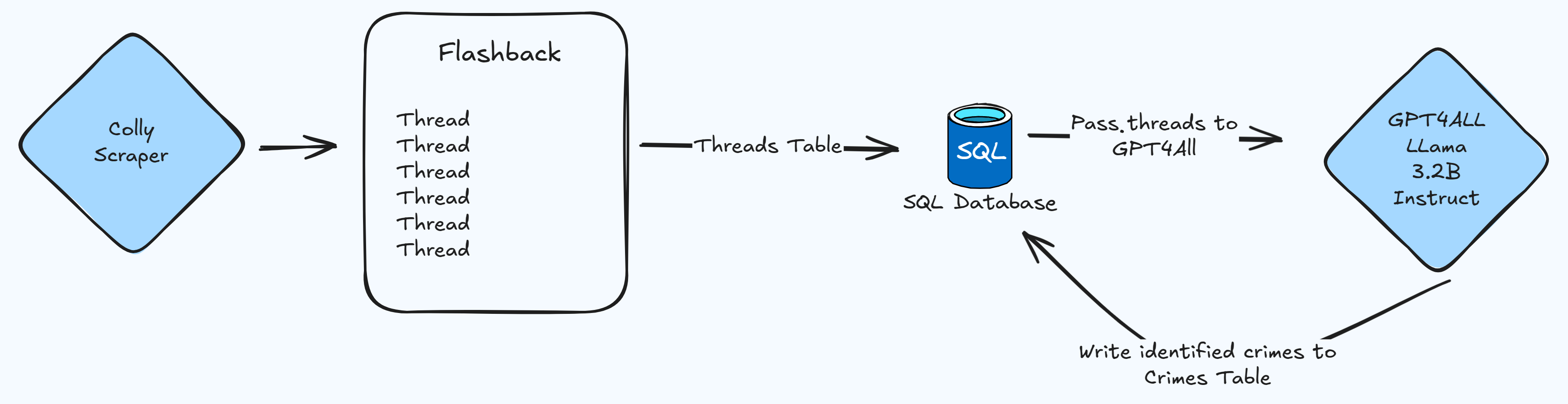 - Web Scraping: Using Go Colly, I extracted threads from relevant crime boards and stored them in an SQLite database.